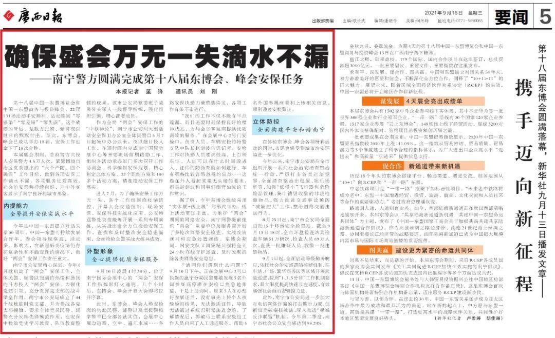 本届盛会期间,首府警方共投入安保警力4.5万人次,紧紧围绕自治区党委提出的“六个严防、四个确保”工作目标,做到各项安保工作滴水不漏,各项服务优质高效,社会治安形势持续向好,向中外宾客展示了南宁良好的城市形象。 《广西日报》报道截图 全警提升安保实战水平 市公安局大活办“四定组”在检查落实四定工作规范情况。 开展系列专项演练。 全心提供优质安保服务 9月10日凌晨4时30分,位于南宁国际会展中心的“两会”安保工作指挥部灯火通明。几个小时后,东博会、峰会开幕大会即将拉开序幕。 此时,东博会、峰会入场安检岗的执勤民警、辅警以及增援警校学警早已全部各就其位,会展中心周边道路、空中、邕江水域……各路安保执勤力量整装待发,各项工作有条不紊进行。 “我们的工作不仅不能有半点疏漏,而且还要时刻保持良好的精神状态,为与会宾客展商提供优质高效的服务。”在会展中心2号门安检口,负责人员、车辆安检的特警支队中队长赵剑波告诉记者。安检工作对执勤人员要求很高,上百种车证、人证可以在什么时间段进入、证件的防伪查验如何进行、车有哪些比较容易忽视的盲点……这些在外人看起来毫无头绪的要求,都是赵剑波和同事们倒背如流的工作常识。 据了解,今年东博会继续采用“实体展+线上展”的形式举办,线上活动更加丰富。为维护“两会”期间的网络安全,南宁网警提前组织“两会”重要单位及服务商开展了多轮次网络安全检查、实战攻防演习和应急处置演练。东博会期间,网安支队又调集精兵强将全天24小时在线守护巡查,及时发现消除各类网络安全隐患。 “请问你们遇到什么问题?”9月10日下午,正在会展中心2号口执勤的邕宁分局民警郭敏发现5名外国参展商停滞在安检口焦急地张望,于是上前询问。原来5人在办理好参展证后,没有事先上传个人核酸检测结果,无法激活证件,导致无法通过系统识别无法进会场。了解情况后,郭敏马上联系安检组工作人员启用了人工通道服务,帮助5名外国参展商顺利上传相关信息,顺利通过安检验证。 全面构建平安和谐南宁 在体验东博会、峰会各项精彩活动的同时,市民也感受到城市治安环境进一步优化。 今年以来,南宁市公安局在全市组织开展一系列社会治安清查整治统一行动,严厉打击各类违法犯罪,全面清查整治出租屋、娱乐场所等,加强“低慢小”飞行器和危险物品管理,集中销毁收缴的非法枪爆物品,强力推进交通事故预防“减量控大”工作,整治道路交通违法行为。 8月25日起,南宁市公安局全面启动15个环邕安全检查站。截至9月13日18时,全市环邕检查站共检查车辆51万辆次、检查人员69万人次,查获一批嫌疑人员,收缴一批违禁物品。 9月1日起,全面启动等级勤务响应,依托社会治安巡逻防控新机制,在车站、广场、繁华商务区等区域开展武装巡逻,按照“1、3、5分钟”工作机制要求,最大限度提高快速反应速度,有效增强社会面治安管控力量。 此外,南宁市公安局进一步加大对电信网络诈骗的打击整治力度,创新侦查破案技战法,深入推进“绿城反诈联盟”机制。今年第二季度,南宁市社会公众安全感达到98.24%。 (来源:广西日报 蓝锋 刘刚)